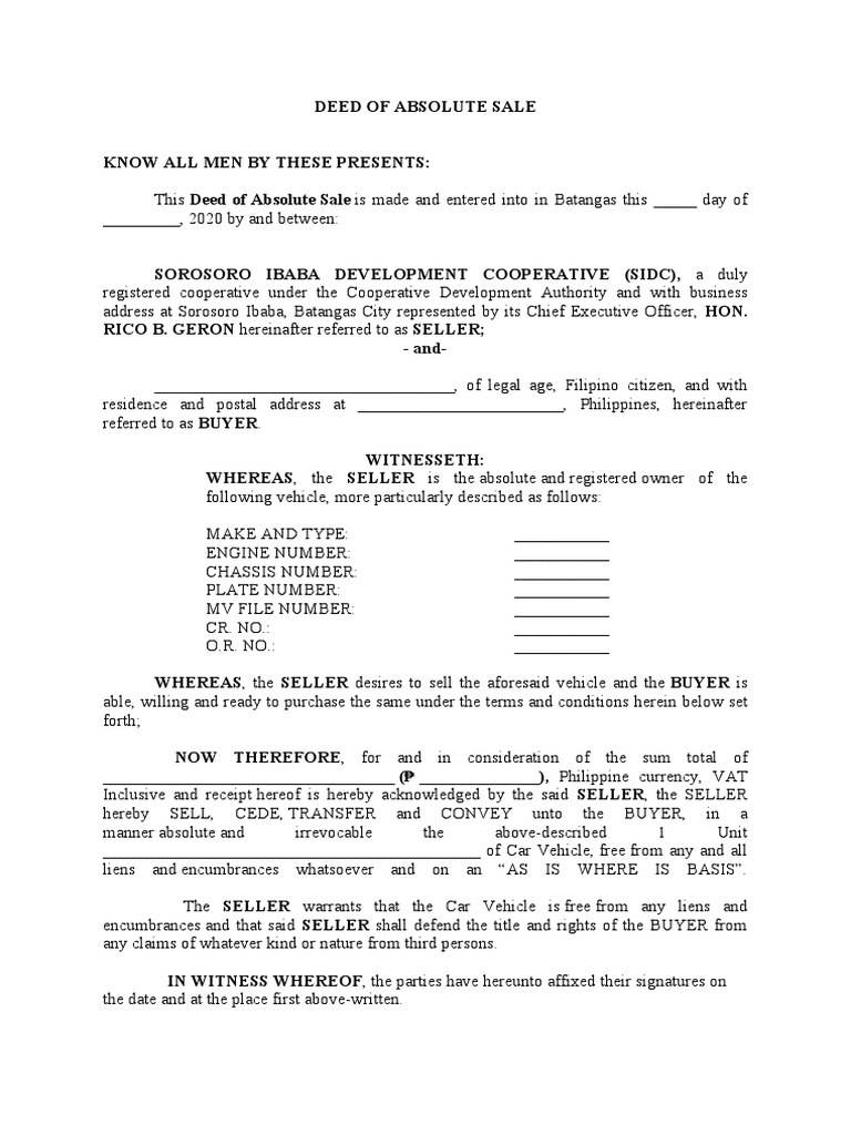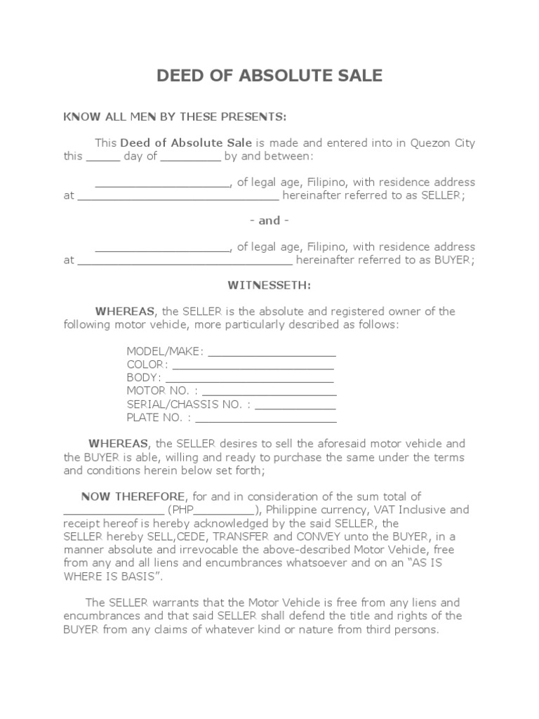 Deed Of Absolute Sale Of A Motor Vehicle Template