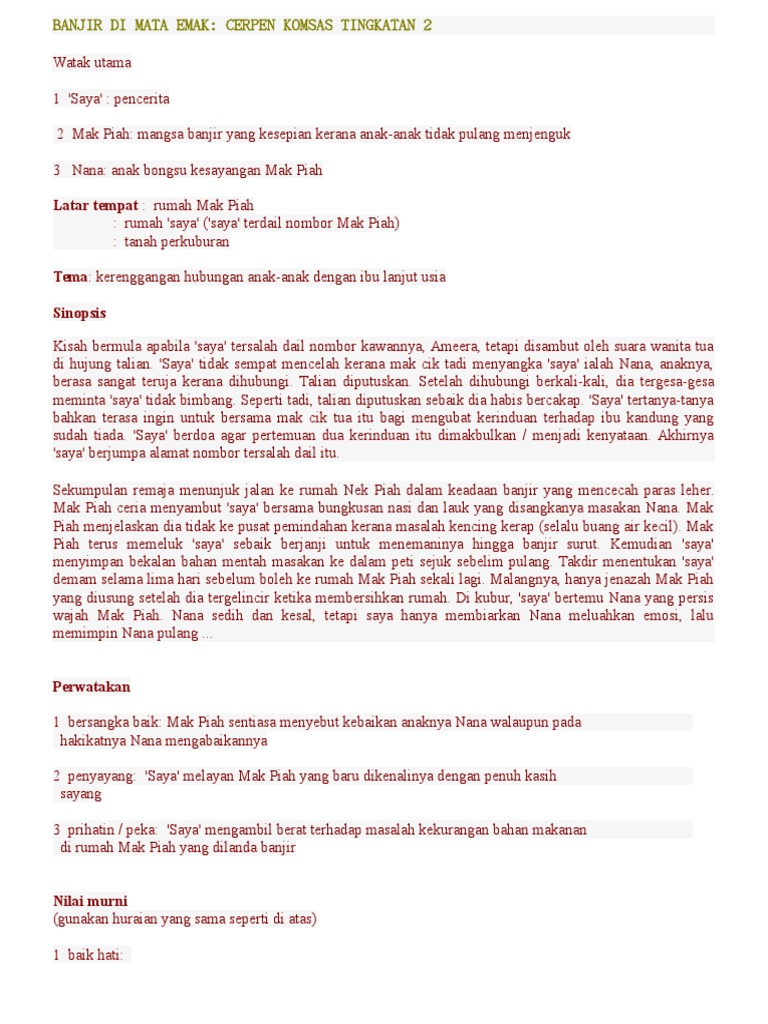 Cerpen Banjir Di Mata Emak Tingkatan 2 Nota