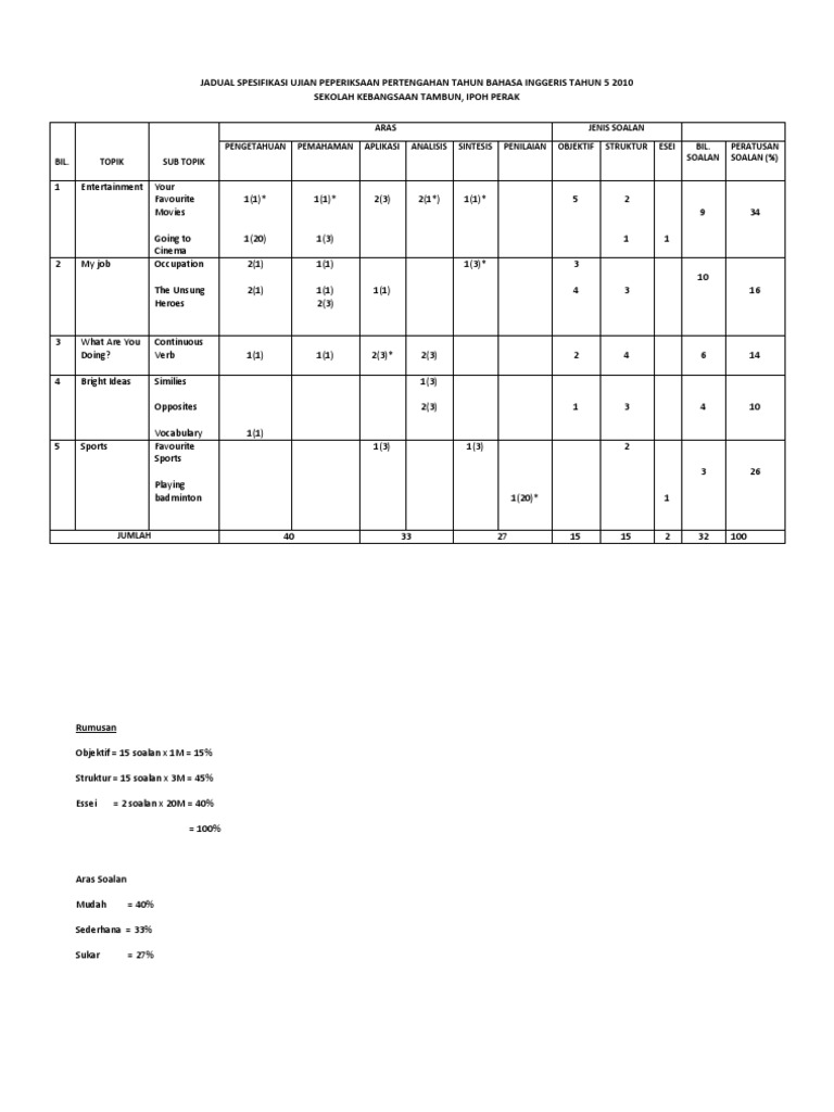 Contoh Jadual Spesifikasi Ujian Bahasa Inggeris