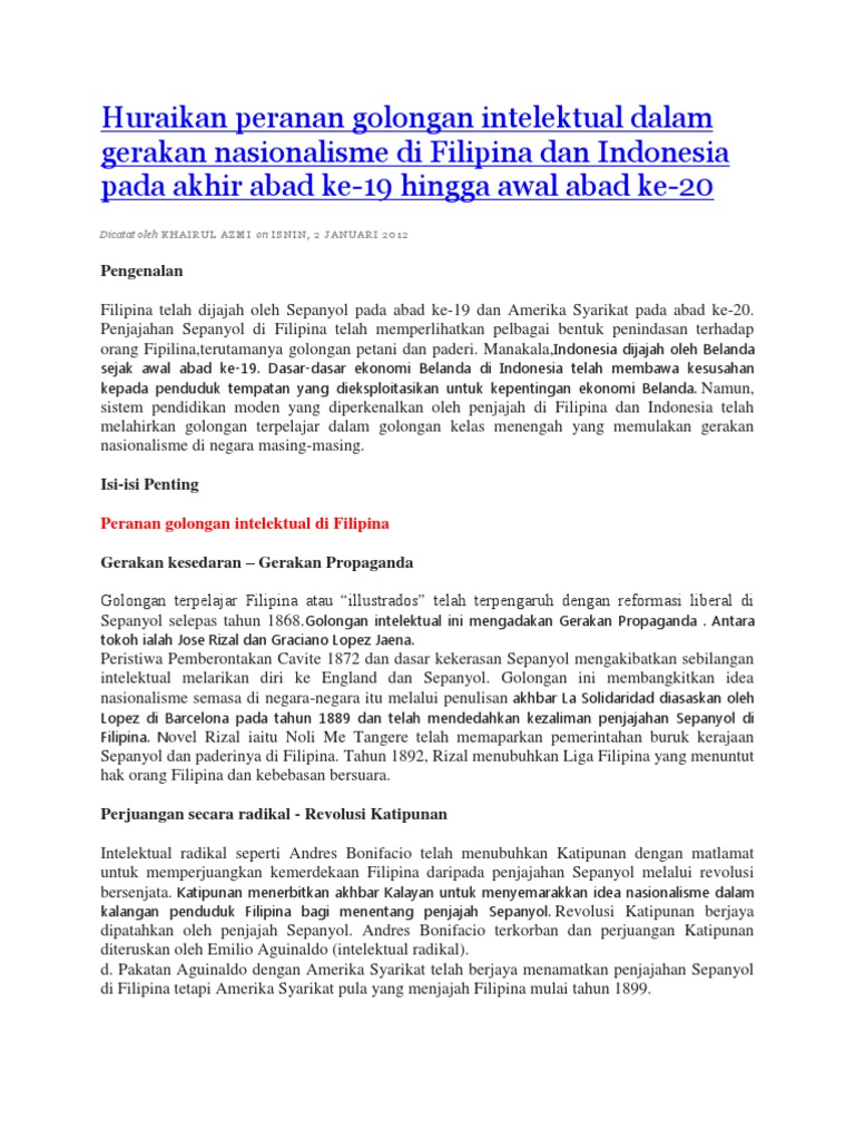 Huraikan Peranan Golongan Intelektual Dalam Gerakan Nasionalisme Di Filipina Dan Indonesia Pada Akhir Abad Ke