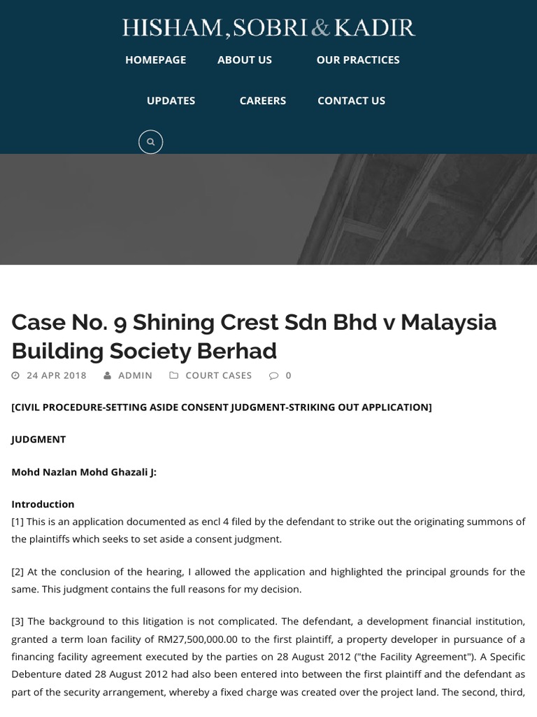 Case No 9 Shining Crest Sdn Bhd V Malaysia Building Society Berhad Hsk Lawsuit Consent Decree