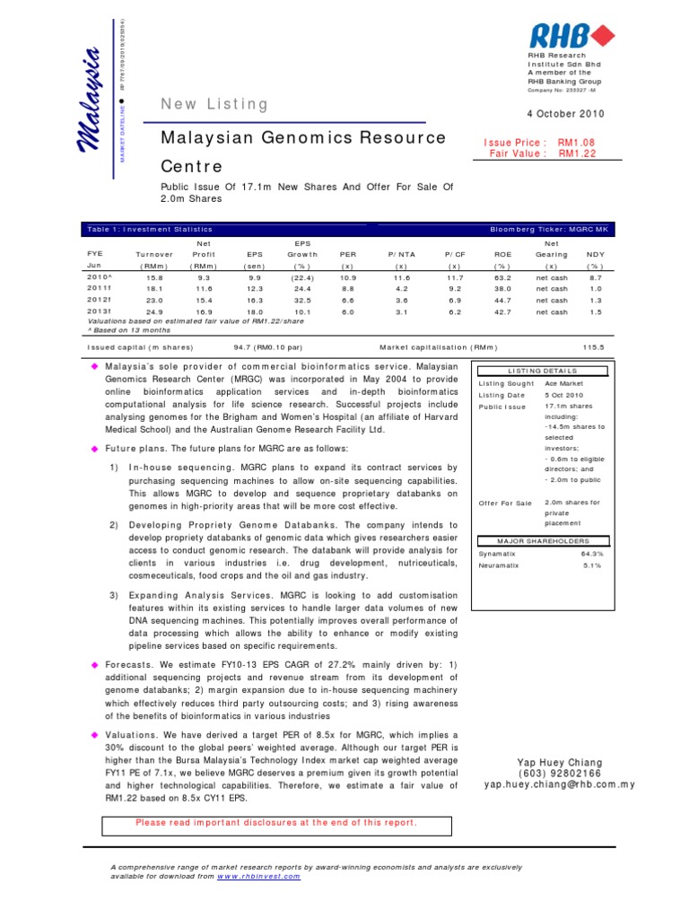 Malaysian Genomics Resource Centre Berhad Public Issue Of 17 1m New Shares And Offer For Sale Of 2 0m 04 10 2010 Bioinformatics Securities Finance