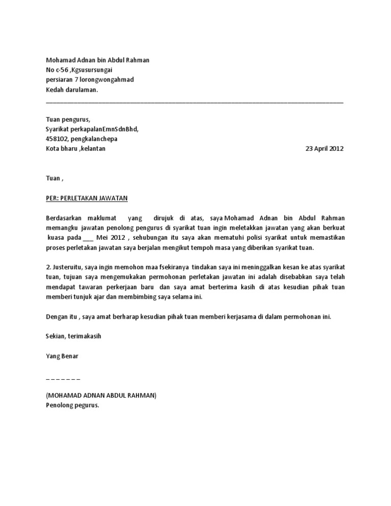 Contoh Surat Berhenti Kerja Surat Perletakan Jawatan