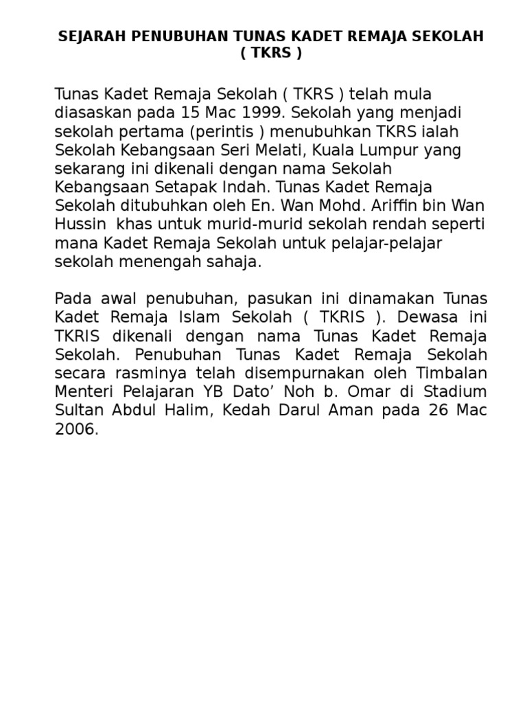 Tunas Kadet Remaja Sekolah Sejarah Penubuhan Tunas Krs