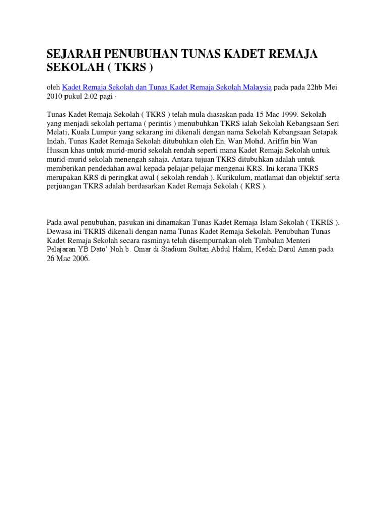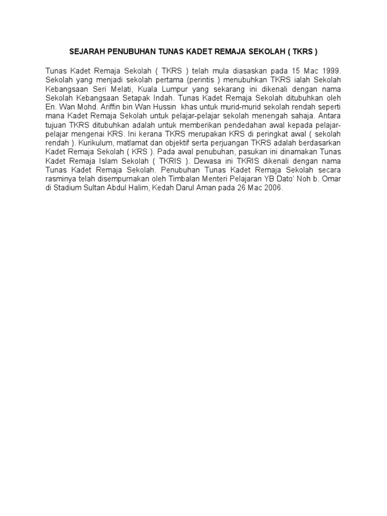 Sejarah Penubuhan Tunas Kadet Remaja Sekolah Tkrs