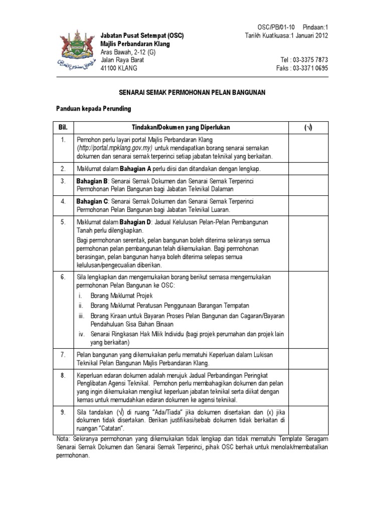 Senarai Semak Permohonan Pelan Bangunan Mpklang Kuatkuasa 150612