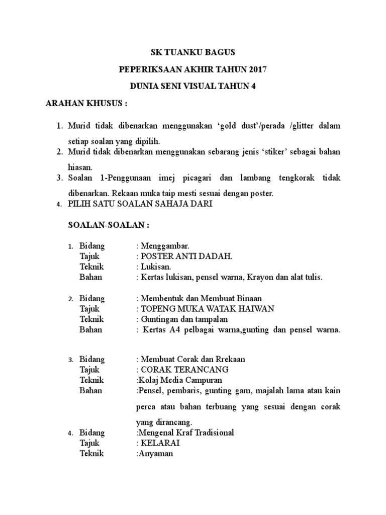 Sk Tuanku Bagus Peperiksaan Akhir Tahun 2017 Dunia Seni Visual Tahun 4 Arahan Khusus
